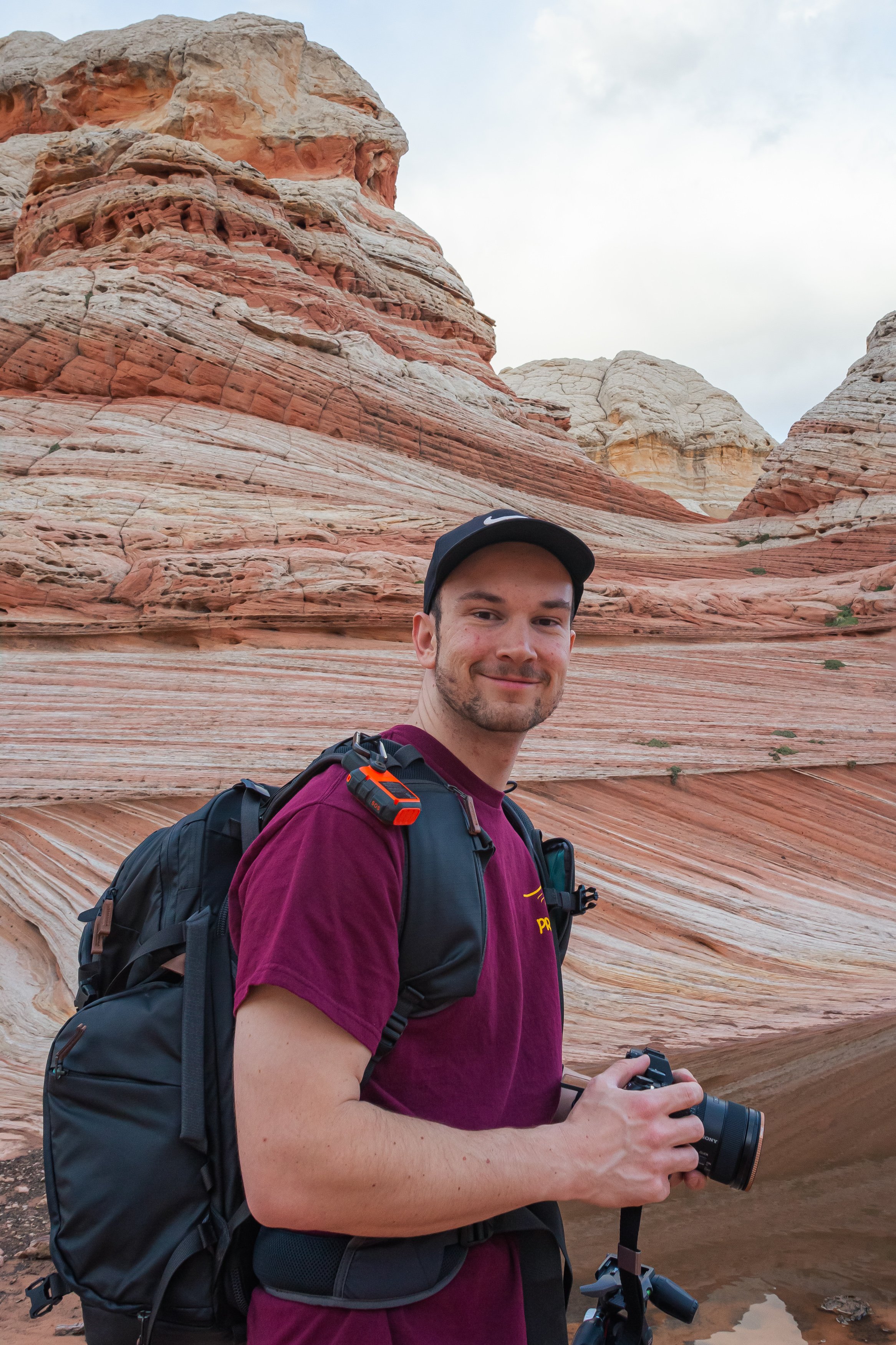 A photo of myself, Alex Miller, in front of a unique rock formation at South Coyote Buttes in Northern Arizona. I am wearing a long sleeve black shirt and a black hat with a backpack on.
